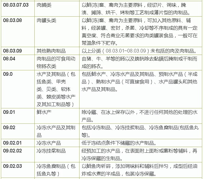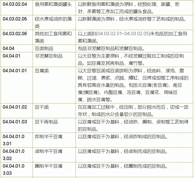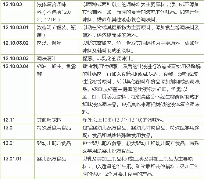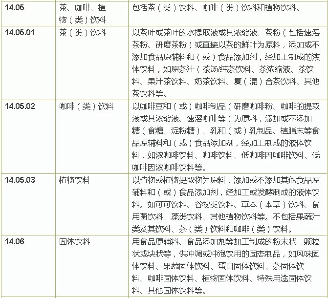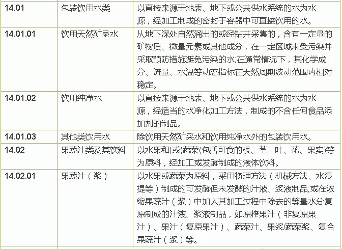 1、食品分類(lèi)采用《GB 2760-2014 食品安全國(guó)家標(biāo)準(zhǔn) 食品添加劑使用標(biāo)準(zhǔn)》中的“食品分類(lèi)系統(tǒng)”,包含16大類(lèi)食品。 2、GB 2760-2014中的食品分類(lèi)除“調(diào)味品、特殊膳食、飲料類(lèi)、酒類(lèi)和其它類(lèi)等類(lèi)別”之外,大部分是按照“食品主原料”進(jìn)行分類(lèi)。因此,在食品生產(chǎn)許可分類(lèi)中的一些產(chǎn)品類(lèi)別需要根據(jù)食品的主要原料在“2760食品分類(lèi)系統(tǒng)”中查找。舉例如下: (1)“餅干”、“糕點(diǎn)”等在“焙烤食品”中查找。 (2)“食糖”、“蜂蜜”在“甜味料”中查找。 (3)“糖果”、“可可及焙烤咖啡”在“可可、巧克力及糖果”中查找。 (4)“罐頭類(lèi)食品”、“速凍食品”等則需根據(jù)原料來(lái)查找。如“畜肉罐頭”和“禽類(lèi)罐頭”在“肉及肉制品”的“熟肉制品”下;“八寶粥罐頭”則在“糧食及糧食加工品”的“雜糧制品—八寶粥罐頭”下;“蔬菜罐頭”在“水果、蔬菜及其制品”的“蔬菜—加工蔬菜—蔬菜罐頭”下;“水果罐頭”則在“水果、蔬菜及其加工制品”的“水果—加工水果—水果罐頭”下。 |
